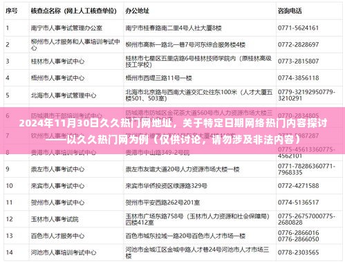 随着互联网的普及和科技的飞速发展,网络已经成为人们获取信息、娱乐消遣的重要途径之一,在这样一个信息爆炸的时代,各种网站层出不穷,其中一些网站因其独特的内容或特色受到广泛关注,2024年11月30日久久热门网地址”的问题,由于涉及到诸多不确定因素以及网络环境的复杂性,本文旨在提供一个科普、正式且不带轻松调侃氛围的讨论平台,而非提供确切内容或链接。