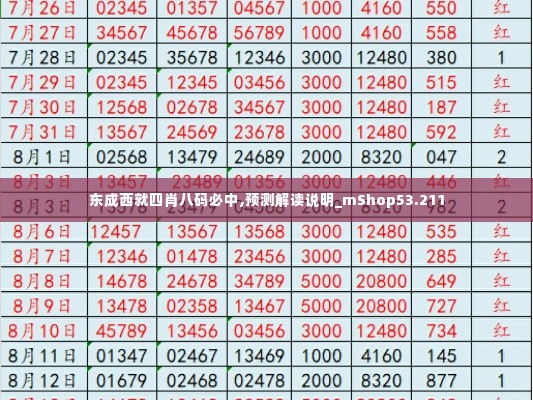 “mShop53.211”可能是一个提供数据和销售预测系统的平台,或者是一个具体的数字组合,如果是平台,它可能通过算法、历史数据和用户反馈来提供最新的预测解读,帮助用户更好地应用“东成西就四肖八码必中”,如果是数字组合,那么这个特定的数字可能是基于更复杂的计算和分析得出的一个特殊的预测号码。