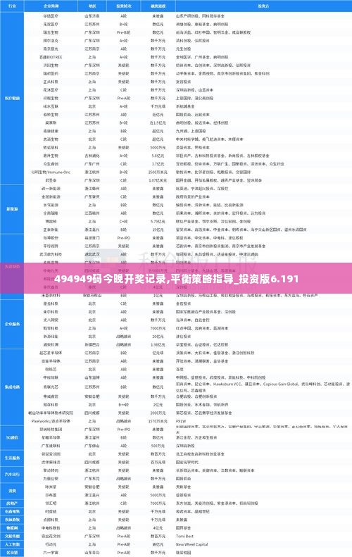 在探讨今晚494949码开奖记录的同时,我们也不能忽视彩票投资中的一个重要概念——平衡策略。平衡策略,或者说均衡投资,是指在投资过程中采取一种多元化的投资手段,以分散风险,增加收益的可能性。对于彩票投资而言,平衡策略意味着不要将所有资金都投入到一组号码或者一种投注方式中,而是根据历史数据和开奖记录,合理分配资金,以期获得更稳定的回报。