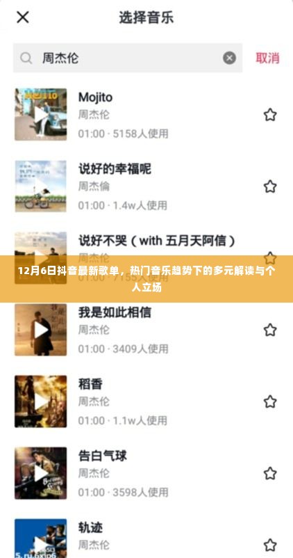 随着互联网的普及和社交媒体的繁荣,音乐传播的方式也在发生着深刻变革,抖音作为当下最热门的短视频社交平台之一,其歌单更新情况往往能够迅速引领音乐潮流,在这样一个时代背景下,本文将聚焦于分析近期(特别是12月6日抖音最新歌单)的音乐流行趋势,探讨其背后反映的社会文化现象,同时阐述个人立场及理由。
