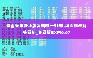 在当今瞬息万变的投资环境中,风险管理成为了每个投资者关注的焦点。在这样的背景下,"香港管家婆正版资料图一95期" 为我们提供了极具参考价值的市场洞察,而其背后的风险规避解答解析,尤其是 *梦幻版BXM6.67*,更是为投资者在复杂市场中提供了指引。本文将深入探讨这些资料的意义及其在风险规避中的重要性。
