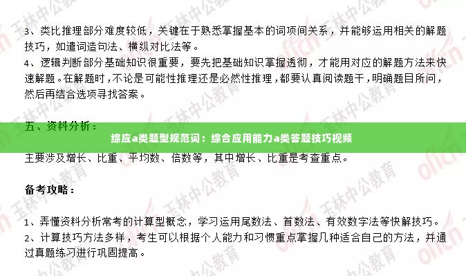 综应A类题型,全称为综合应用能力A类题型,是公务员考试中的一种重要题型。这类题型主要考察考生对政策法规的理解、分析能力,以及解决实际问题的能力。它通常要求考生在限定的时间内,对给出的材料进行深入阅读,提炼关键信息,并结合自身所学知识,提出合理的解决方案或评价。