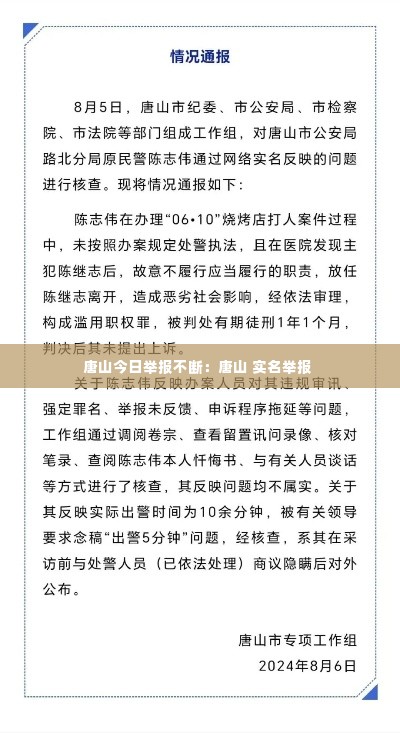 总之,唐山今日举报现象是社会进步和治理能力提升的体现。只有充分发挥举报工作的作用,才能更好地维护社会稳定,促进社会和谐发展。