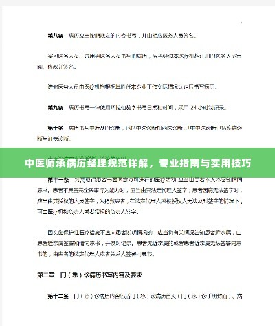 中医师承病历整理规范是中医临床工作的基本要求,对于提高医疗质量、保障患者权益、促进中医传承具有重要意义,我们应该加强中医师承病历整理规范的培训、监督和反馈,确保规范的落实,我们还应该不断探索和完善中医师承病历整理规范,以适应中医事业发展的需要,通过大家的共同努力,我们相信中医师承病历整理规范将得到更好的推广和应用,为中医事业的发展做出更大的贡献。