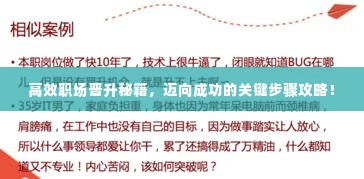 在现代职场环境中,升职不仅意味着更高的地位和更高的薪酬,更是对个人能力的肯定,要想实现这一目标,掌握高效职场升职技巧至关重要,本文将为您揭示一些关键的升职技巧,助您在职场中脱颖而出,迈向成功。