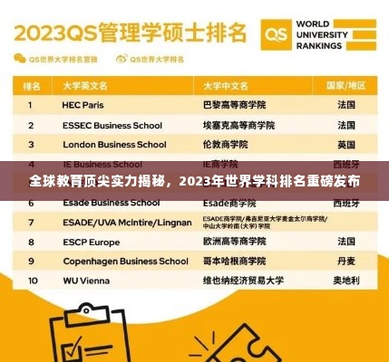 随着全球教育的不断发展,学科排名成为了衡量各国教育水平的重要指标之一,世界学科排名2023正式公布,这一排名涵盖了全球各个国家和地区的顶尖学科实力,成为了全球关注的焦点,本文将围绕这一主题,探讨全球教育领域的最新动态和趋势。