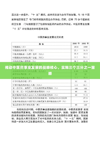 中医药作为我国独特的医疗资源,对于维护人民健康、促进经济社会发展具有重要意义,近年来,随着国家对中医药事业的重视程度不断提升,中医药发展迎来了新的机遇,为深入推动中医药事业发展,我们必须积极落实“中医药三个三分之一”战略,确保中医药传承创新、服务群众、走向世界的任务得以有效实施。