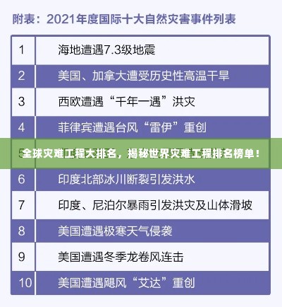 随着全球化和科技发展的不断推进,灾难工程已成为现代社会面临的重要议题,这些工程旨在预防、减轻自然灾害等造成的损害,保护人们的生命财产安全,本文将探讨世界范围内的灾难工程,并对其进行排名,以期更好地了解这些工程的重要性和影响力。