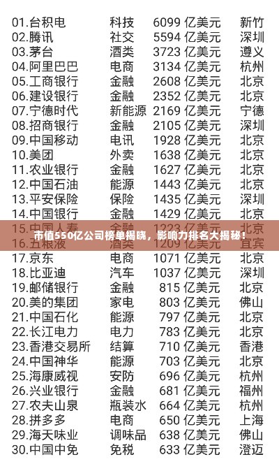 转载请注明来自天津锦麟商贸有限公司,本文标题:《市值550亿公司榜单揭晓,影响力排名大揭秘!》