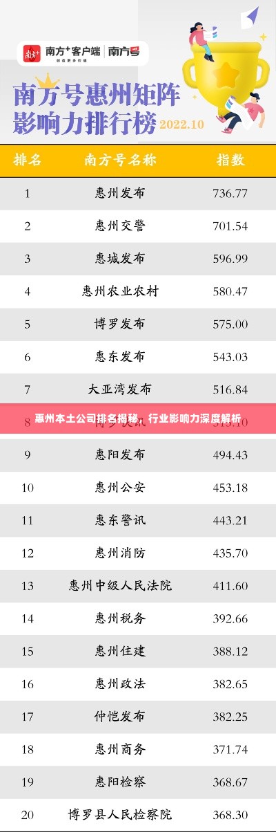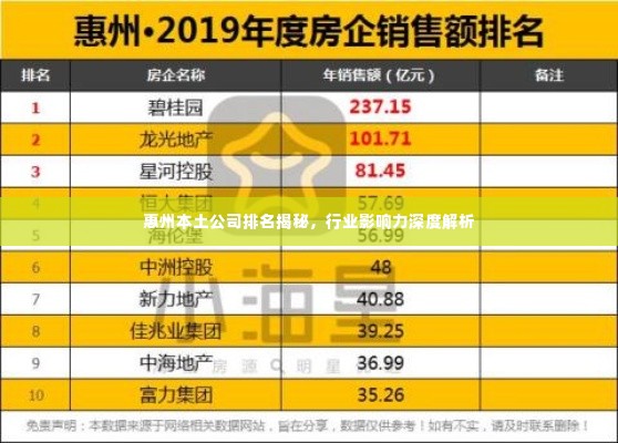 惠州,作为广东省的重要城市之一,近年来经济发展迅速,本土企业也如雨后春笋般崭露头角,本文将为您揭示惠州本土公司的排名及相关行业影响力分析。