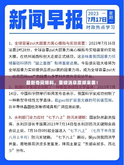 今日奇闻爆料最新消息涵盖了科技、娱乐、社会热点、体育、奇闻异事、文化艺术以及医学等领域,这些消息不仅让我们了解世界的变化,也让我们感受到生活的丰富多彩,希望这些消息能为您带来一丝乐趣和启发。